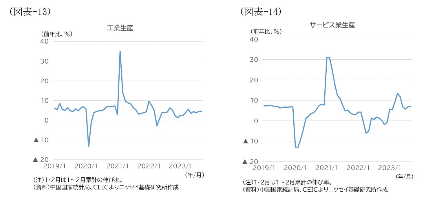 なお、関連する月次指標の推移を見ると(図表-13、14)、工業生産は年初来緩やかながら回復基調にある。他方、サービス業生産は昨年の反動で年初から5月にかけて高い伸びをみせた後、その影響がはく落した6月には伸びが低下したが、再び持ち直しつつある。