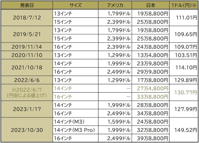 2021年(10月)、2023年(10月)はいずれも「14インチ」が1,999ドル、「16インチ」が2,499ドルで、こちらも値上げはありません。なお、今回(2023年10月30日発表)、「14インチ」は「M3」搭載が1,599ドル、「M3 Pro」搭載が1,999ドルとなっており、これまでよりも割安な価格帯のバージョンが登場しています。