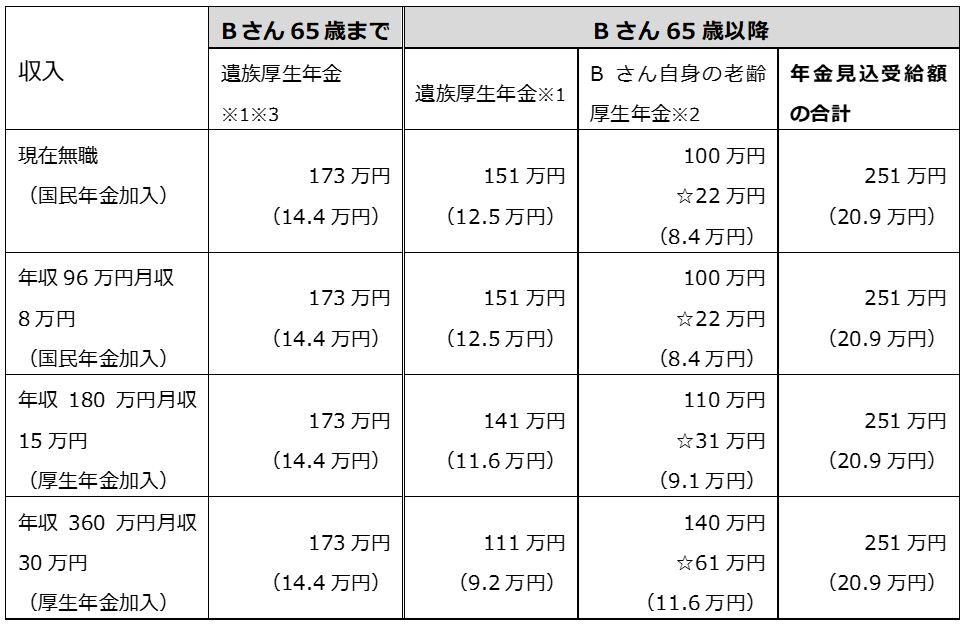※3 中高齢寡婦加算59万6,300円(令和5年度の額)を含む。中高齢寡婦加算は、厚生年金の被保険者(Aさん)が亡くなったとき、その妻が40歳以上65歳未満の間遺族厚生年金に加算されるもの。本来の受給額は173万円。
