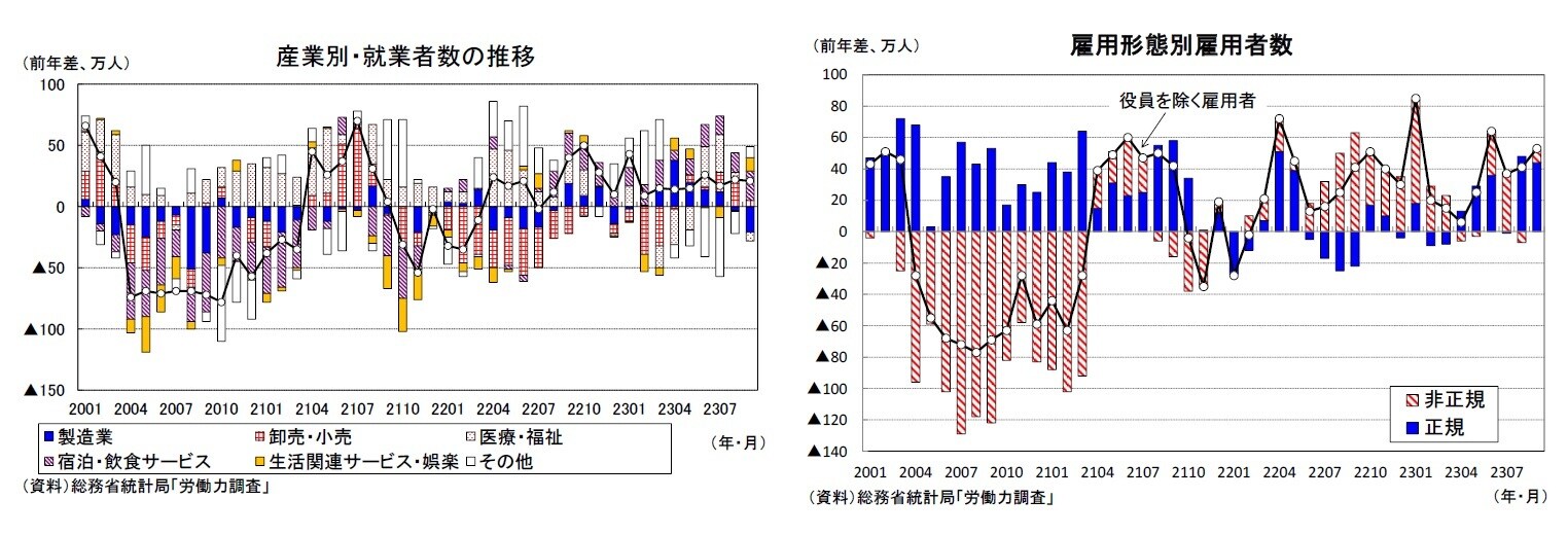 産業別には、製造業が前年差▲21万人減(8月:同▲3万人減)と2ヵ月連続で減少し、医療・福祉が前年差▲7万人減(8月:同6万人増)と4ヵ月ぶりに減少したが、生活関連サービス・娯楽業が前年差11万人増(8月:同▲1万人減)と4ヵ月ぶりに増加し、宿泊・飲食サービス業が前年差24万人増(8月:同16万人増)と15ヵ月連続で増加した。