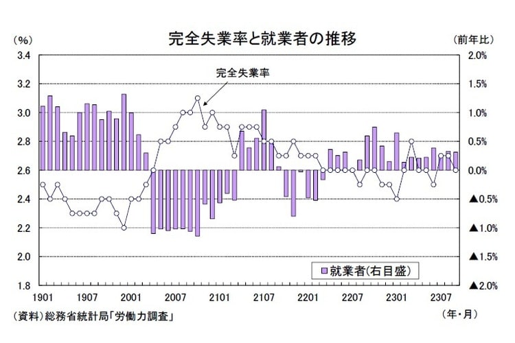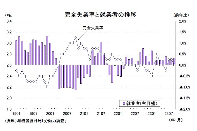 総務省が10月31日に公表した労働力調査によると、23年9月の完全失業率は前月から0.1ポイント低下の2.6%(QUICK集計・事前予想:2.6%、当社予想も2.6%)となった。