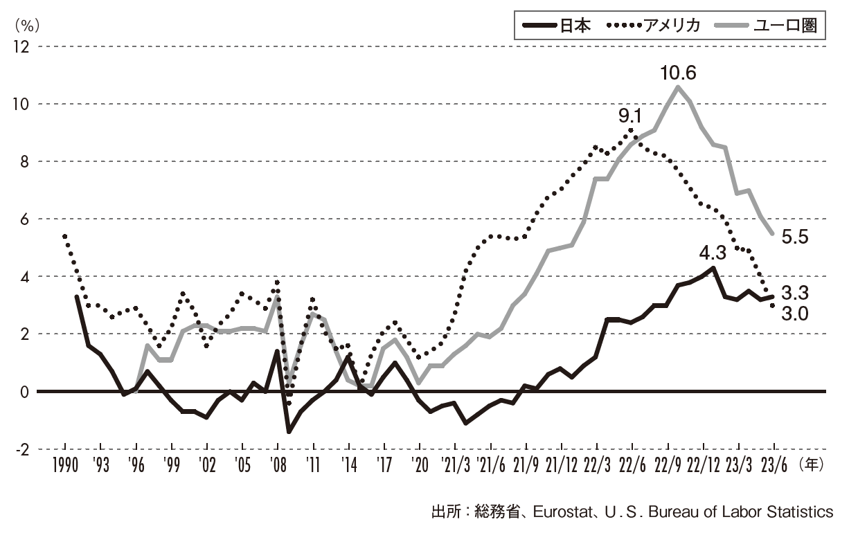 2022年6月には9.1%と約40年ぶりの高水準となりましたが、その後、12か月連続で鈍化し、2023年6月には3.0%となっています。ユーロ圏では、2022年10月に消費者物価指数は前年同月比10.6%上昇しました。