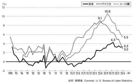 あらためて世界でインフレがどのように推移してきたのかを確認しましょう。図表1を見てください。これは過去約20年間のアメリカ、ユーロ圏、日本のインフレ率の推移を示したものです。