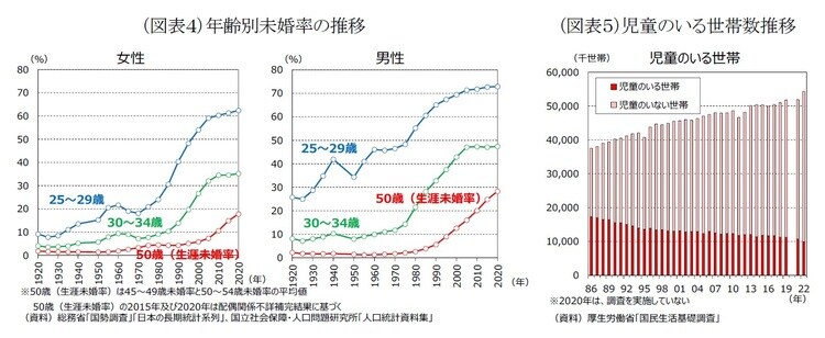 未婚率は上昇傾向にあり、2020年には、25~29歳の女性の62%、男性の73%が未婚であった(図表4)。また、人口減少の影響もあり、1970年には約1743万世帯であった児童のいる世帯数は、2022年には約992万世帯にまで減少した(図表5)。