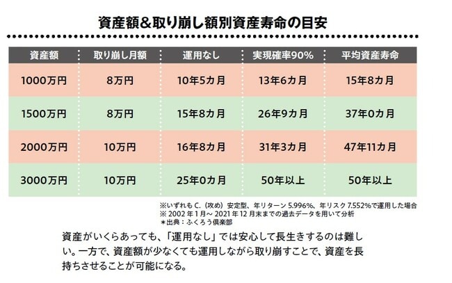 もちろん、市場の変化によって資産寿命は長くなることも短くなることも想定されます。しかし、90%の確率で31年3ヵ月まで資産がもつ可能性があり、運用しなかった場合と比較すれば、資産寿命を約2倍に延ばす可能性が期待できます。このように、運用する・しないで資産寿命は大きく変化するのです。