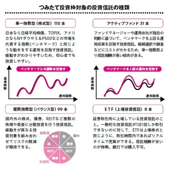 新NISAの「つみたて投資枠」は、現行の「つみたてNISA」を引き継ぐ枠です。購入できる商品は、現在のつみたてNISA対象商品と同じ、「長期・積立・分散投資」に適した投資信託とETF(上場投資信託)に限定されています([図表2]参照)。
