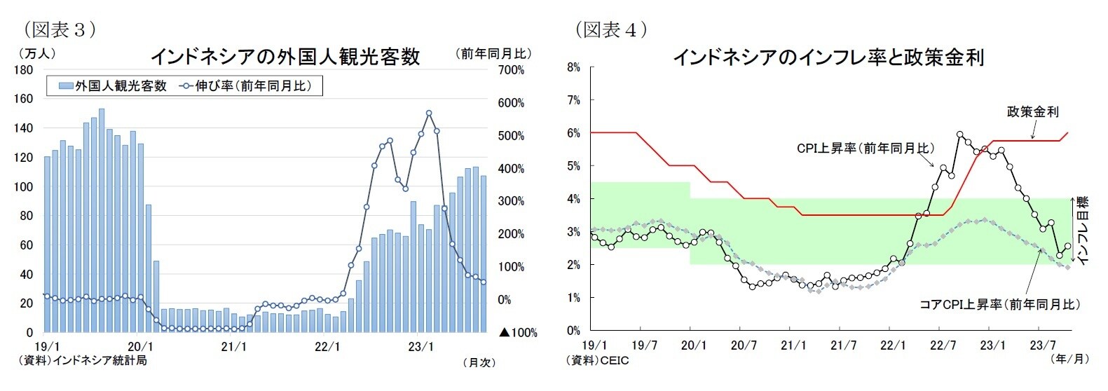 インドネシアでは昨年3月以降、入国規制が段階的に緩和され、外国人旅行者数は今年9月に前年比53%増の107万人となり、コロナ禍前の約8割の水準まで回復したが、足元の回復の動きは鈍ってきている(図表3)。