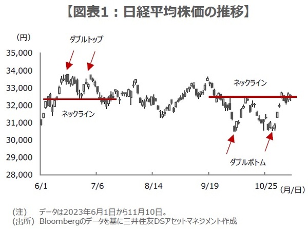 日経平均はその後、夏場にかけて横ばい推移が続きましたが、10月に入ると下げ足を速め、10月4日には30,487円67銭の安値をつけ、前述の下値目途を割り込みました。しかしながら、10月4日安値と10月30日安値(30,538円29銭)で今度はダブルボトムが形成され、11月6日にネックラインの10月13日高値(32,533円08銭)を突破したことで株価上昇のシグナルが点灯し、上値目途として34,600円近辺が示唆されました。