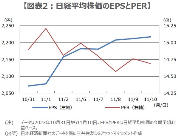 また、日本株上昇の背景には、国内企業の良好な中間決算も影響していると推測されます。日経平均の1株あたり利益(EPS)と株価収益率(PER)について、10月31日以降の動きをみると、図表2の通りとなります。EPSとPERを掛け合わせると現状の株価水準が得られますが、11月の株高は主にEPSの上昇が主導した形になっており、中間決算を経た市場の業績改善見通しを反映した株高といえます。