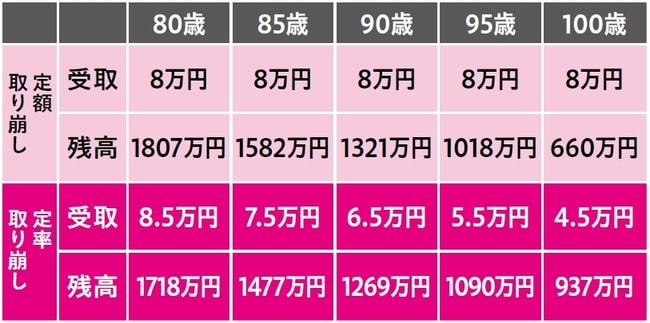毎月8万円の「定額取り崩し」を行うと、98歳で残高が21万円となります。これに対し、年率6.0%での「定率取り崩し」を行うと、受取額は年々減りますが、100歳時点でも937万円の資産が残ります。