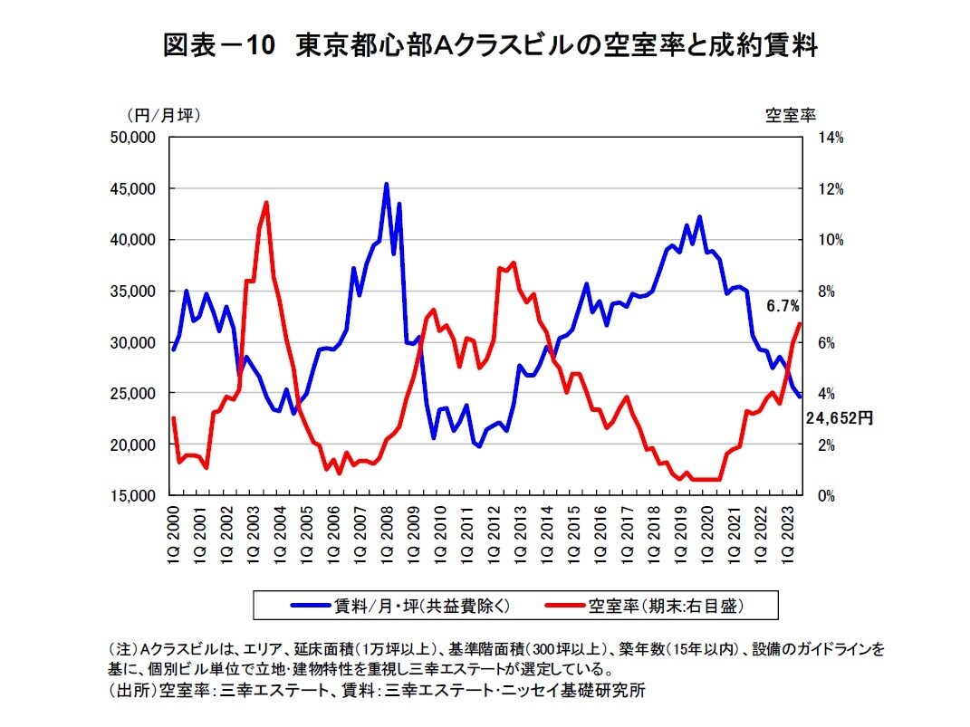 三幸エステート公表の「オフィスレント・インデックス」によると、2023年第3四半期の東京都心部Aクラスビル賃料(月坪)は24,652円(前期比▲3.9%)に下落し、空室率は6.7%(前期比+0.8%)に上昇した(図表-10)。
