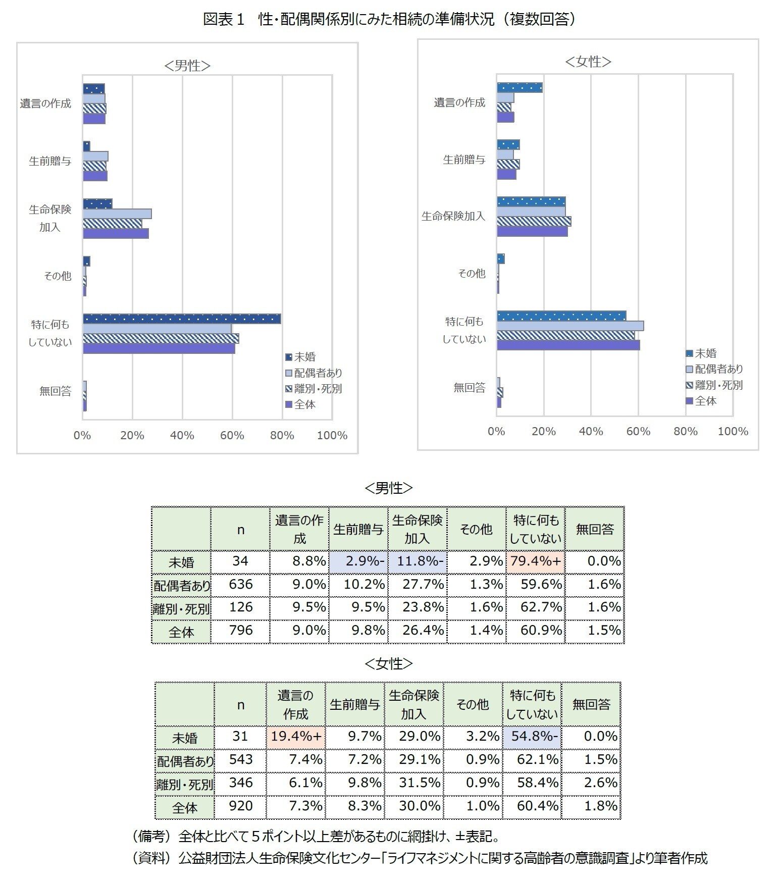 また、当然ではあるが、「財産を残したい親族がいるか」という点も、相続の準備状況に違いを生んでいるだろう。当シリーズの別稿「シングル高齢者の住宅と生活~未婚女性の6割は1日60分以上歩くアクティブ層、未婚男性と離別・死別男女の1割弱は殆ど歩かない不活発層」によると、未婚男性のほとんどは子や孫がいないため4、準備が低調だと考えられる。