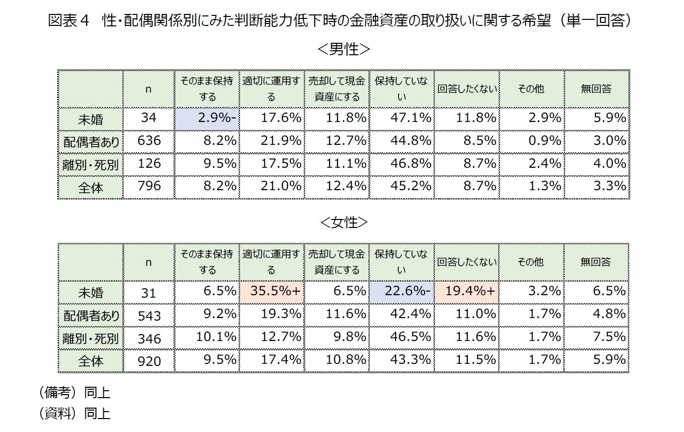 最後に、「将来、判断能力が不十分になったときに株や証券などの金融資産を家族や成年後見人にどのように扱って欲しいですか」との問いに対し、回答を性・配偶関係別に比較したものが[図表4]である(グラフは略)。