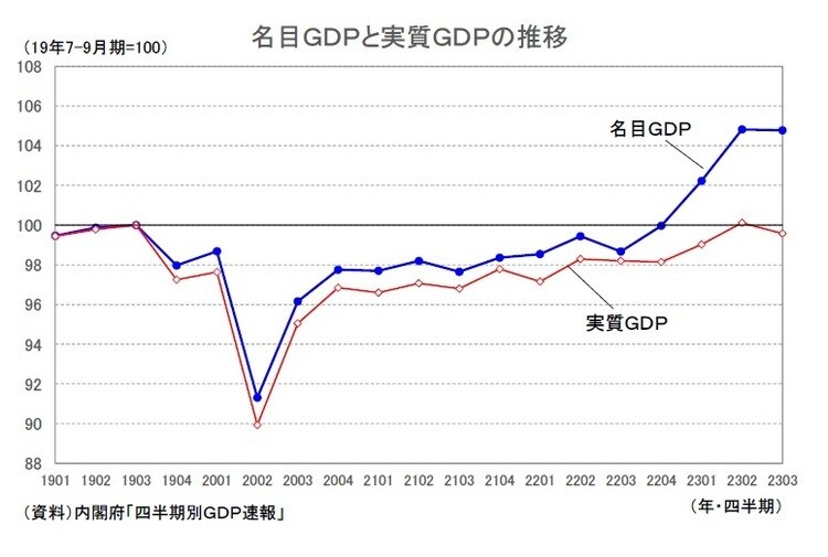 一方、名目GDPは2023年7-9月期には小幅なマイナスとなったものの、それまで高い伸びが続いてきたことから、コロナ禍前のピークを4.8%上回っている。
