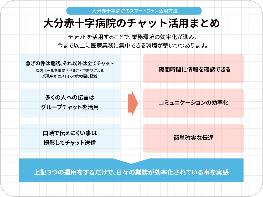 当院では「急ぎの要件は電話、それ以外はチャット」で運用するように周知しております。重要でないような案件や緊急性のない案件につきましては、スキマ時間で対応できますので、自分のペースで仕事ができるようになり、効率性を大きく上げています。