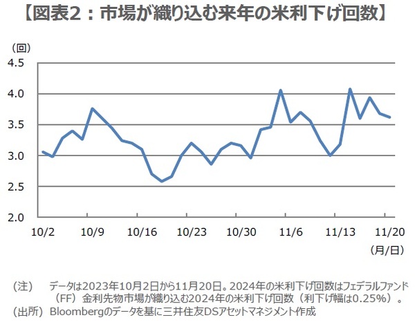 つまり、弊社は米国のインフレ率が来年2%近辺まで低下するには至らないと考えており、FRBは利下げの判断を2024年いっぱい見送る可能性が高いと予想しています。なお、フェデラルファンド(FF)金利先物市場に目を向けると、11月20日時点で2024年は4回近い25ベーシスポイント(bp、1bp=0.01%)の利下げが織り込まれており(図表2)、弊社の見方は市場よりもかなりタカ派的です。
