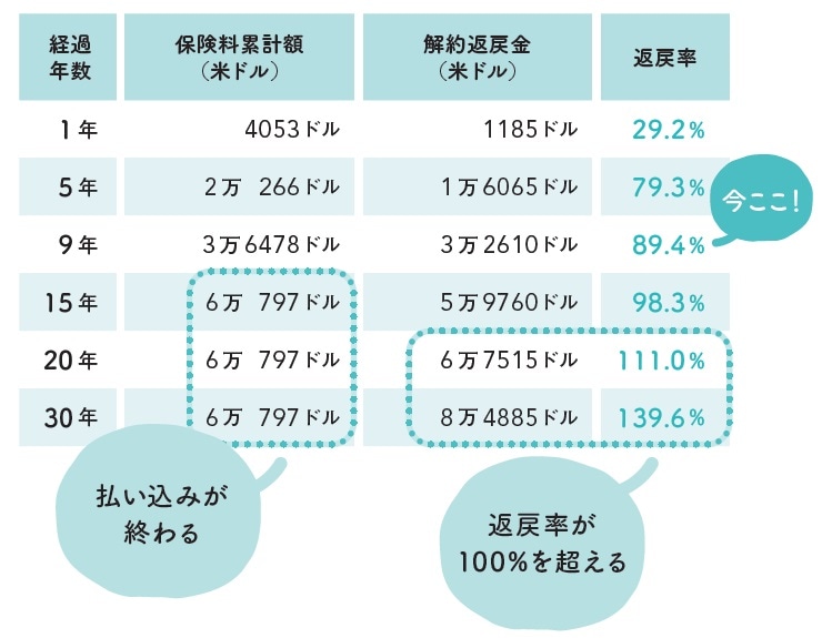 「掛け捨てにならない終身保険はいかがですか。これから6年間、保険料を払えば、一生涯の保障が付いて、解約したときには返戻金があります。返戻金が、支払った保険料に対してどれくらいになるかというと、保険料を払い終えるまでの6年間は、いつ解約しても、ドルベースではマイナスです。プラスになるのは、保険料を払い終わった後で、そこからさらに5年間、解約しないでおくと111%の返戻率になります」