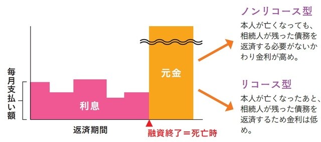 これは、60歳以上向けの住宅ローンで、購入やリフォームをする自宅などを担保にお金が借りられます。生きている間に返済するのは利息のみ。元金は死後、物件を売却して返済します。ノンリコース型の場合は担保物件の売却代金が残債務に満たなくても、残った債務を相続人が支払う必要がないため、99%がこのタイプを選んでいるそうです。