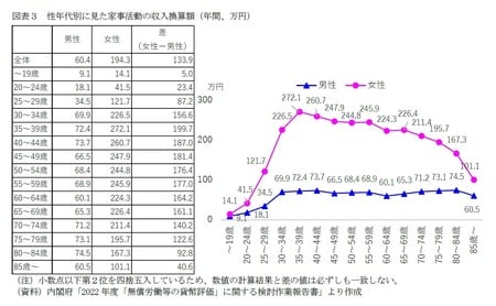家事活動の収入換算額については、内閣府の報告書によると、全体で男性では年間60.4万円、女性では194.3万円(男性より+133.9万円)であり、給与収入と異なり、全ての年代で女性が男性を上回る([図表3])。