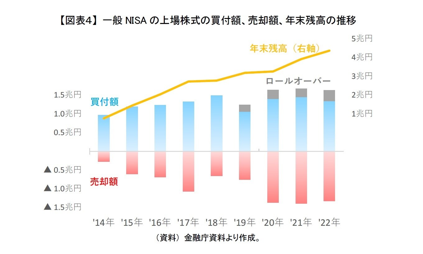 このように売却が多かったことや5年で課税口座に移管されることもあり、2022年末時点で上場株式の残高は4.4兆円しかなかった。