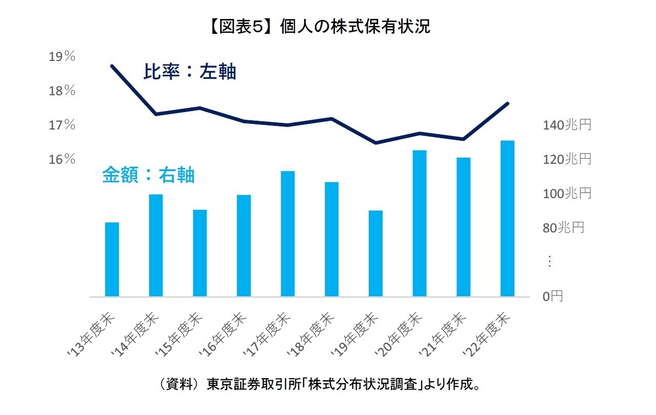 それでも一般NISAでの上場株式は2022年末に残高が4.4兆円まで膨らんだわけであり、そのほとんどが日本株式だと推測される。しかし、東京証券取引所の「株式分布状況調査」をみると、一般NISAの残高増加に伴って個人の株式保有が増えている様子は確認できない[図表5]。