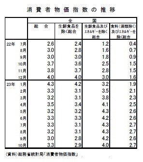 生鮮食品及びエネルギーを除く総合(コアコアCPI)は前年比4.0%(9月:同4.2%)、総合は前年比3.3%(9月:同3.0%)であった。コアCPIの内訳をみると、ガソリン(9月:前年比8.7%→10月:同5.0%)、灯油(9月:前年比7.5%→10月:同4.8%)は上昇率が鈍化したが、電気代(9月:前年比▲24.6%→10月:同▲16.8%)、ガス代(9月:前年比▲12.5%→10月:同▲10.2%)の下落率が縮小したことから、エネルギー価格の下落率は9月の前年比▲11.7%から同▲8.7%へと縮小した。