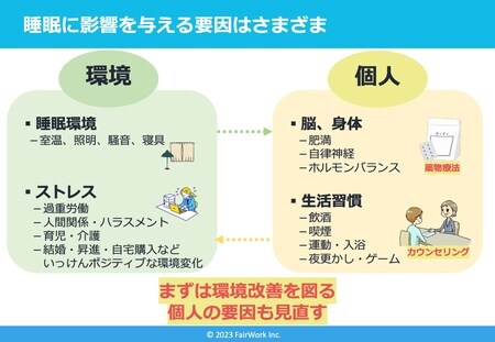 企業にできる睡眠支援策は、環境要因と個人要因に分けられる。ポジティブに見える環境変化でもストレスとなる可能性が