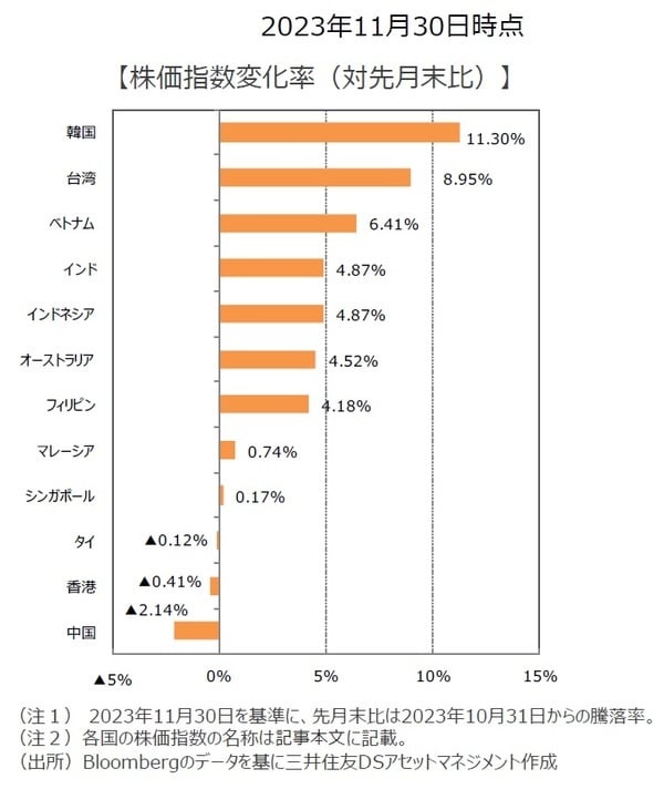 米連邦準備制度理事会(FRB)による利上げ打ち止めに対する期待感が高まったことを受けて米国株式市場が上昇し、アジア・オセアニア株式市場も連れ高となった。韓国は、韓国金融委員会が株式の空売りを禁止したことなどから上昇し、台湾も米中首脳会談を受けて、地政学リスクが緩和したことや、半導体大手の台湾セミコンダクターの月次売上高が過去最高を更新したことなどから堅調だった。ベトナムは、米ドルに対しベトナムドンが堅調に推移したことが好感され、10月の消費者物価指数(CPI)が鈍化したインドも上昇。オーストラリアは国債利回り低下により不動産関連セクターが堅調に推移したほか、中国の景気対策などを受けて鉱山株も上昇した。一方、香港や中国本土は、中国の物価統計の低迷による景気減速懸念などから軟調だった。