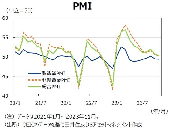 製造業購買担当者景気指数(PMI)は11月に市場予想を下回り、49.4へ低下した。需要不足が深刻化した影響とみられる。また、製品価格指数が引き続き50割れとなったことから、多くの製造業では原材料費用など調達コストが上昇しても、製品価格に転嫁することが難しい状況が続いている。この点が製造業発の低インフレをもたらしているとみる。更に、11月の非製造業PMIは市場予想を下回り、50.2へ低下した。家計の需要不足が企業業績を悪化させ、企業が従業員の報酬カットを行うことで家計の購買力が低下するという悪循環に陥っている模様だ。