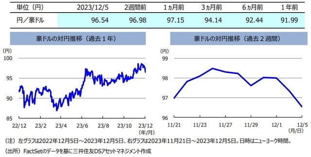 ここ2週間の豪ドルの対円レートは、下落しました。期間前半は豪州準備銀行(RBA)のブロック総裁による利上げに関するタカ派的な発言により、豪ドルは堅調に推移しました。その後、米国の物価関連指標でインフレの鈍化が示され、パウエル米連邦準備制度理事会(FRB)議長やFRB高官らが早期の利下げを否定しない姿勢を示したことにより、早期の利下げ観測が強まって米ドル安円高となり、連れて豪ドルの対円レートは下落しました。12月5日には、金融政策決定会合でRBAが政策金利を据え置き、今後更なる利上げが必要かどうかはデータ次第としたことで、追加利上げ観測が後退し、豪ドルの対円レートは一段と下落しました。
