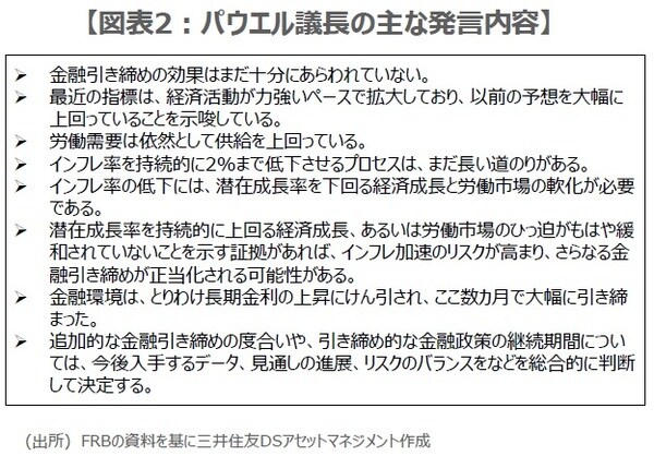 次に、ドットチャートについて、前回9月時点では、2024年は25ベーシスポイント(bp、1bp=0.01%)の利下げ2回、2025年は5回、2026年は4回が、それぞれ適切との見方が示されました(図表1)。今回、市場の注目は、やはり2024年の利下げ回数に集まっていますが、弊社は引き続き2回を見込んでいます。仮に、回数が増えれば、市場は素直にハト派の受け止めになるとみられます。