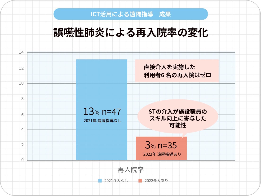 いままで言語聴覚士や看護師の書いた施設間連絡票のやりとりだけでしたが、施設の介護士も実際の映像を共有しながら、「もう少しとろみをつけて」「こういう動きを確認して」といった具体的な指示があるので、学びや成長につながっていますし、誤嚥性肺炎による再入院率が13%から3%に下がりました。