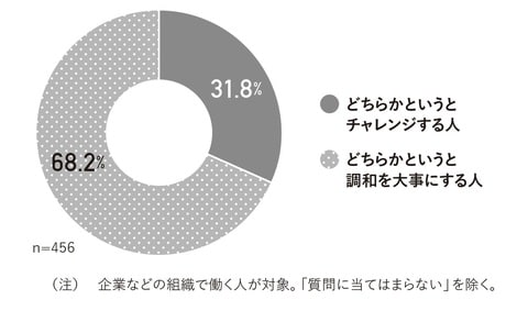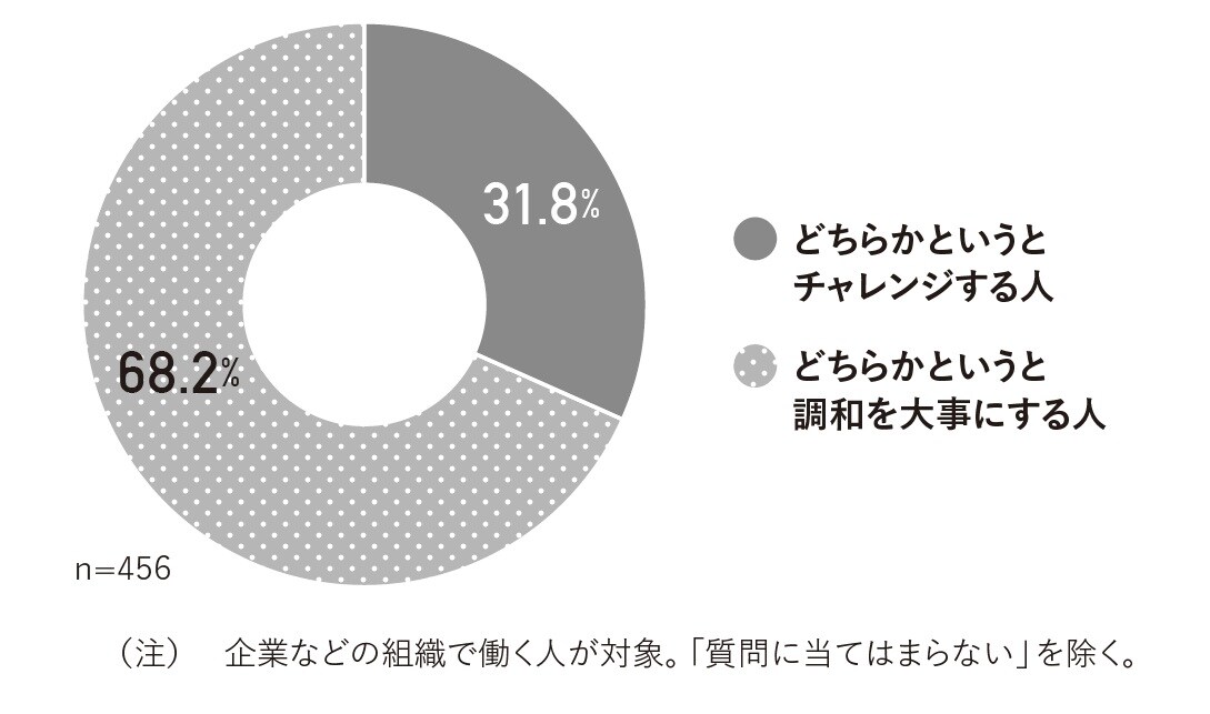ところが「同僚として積極的にチャレンジする人と、周りとの調和を大事にする人のどちらを好みますか?」という質問には、「どちらかというと周りとの調和を大事にする人」という回答が68.2%と7割に迫る一方、「どちらかというと積極的にチャレンジする人」は31.8%にとどまる(図表2)。
