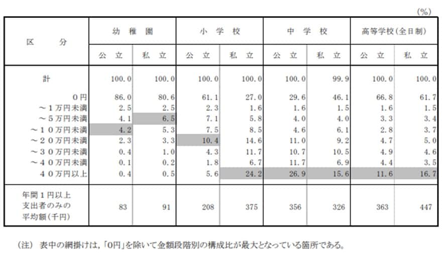 下記の調査結果を見ると、1年間にかかる塾費だけでも私立小学校、公立・私立中学校、公立・私立高等学校(全日制)で「40万円以上」がそれぞれ最も高くなっています。