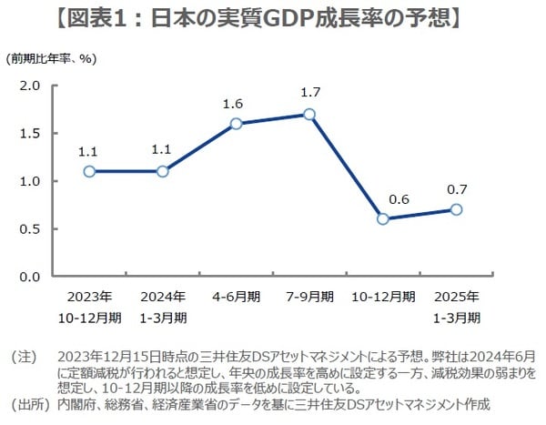 先行きの景気については、経済活動の再開、物価上昇圧力の緩和、賃金の上昇(弊社は2024年の平均賃金上昇率を4.0%と予想)などにより、回復基調に戻るとみています。実質GDP成長率は前期比年率で2023年10-12月期が+1.1%、2024年1-3月期が+1.1%、4-6月期が+1.6%、7-9月期が+1.7%、10-12月期が+0.6%、2025年1-3月期が+0.7%で(図表1)、2023年度は前年度比+1.6%、2024年度は同+1.1%を見込んでいます。
