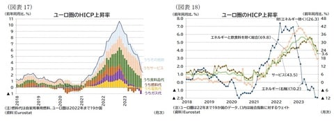 消費者物価(HICP)上昇率は23年11月で前年比2.4%(速報値)となり、22年10月(10.6%)をピークに低下し、ECBの物価目標(2%)が視野に入る状況となった(図表17)。コアHICP上昇率も11月の前年比で3.6%とピーク(23年3月の5.7%)から低下した。