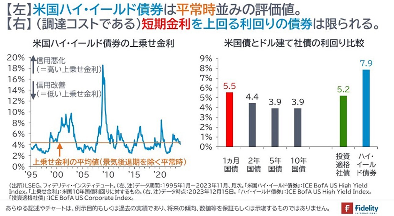 【右の図】に示すとおり、利上げによって(資金調達金利に相当する)短期金利が高まるなか、米国ハイ・イールド債券は、短期金利を上回る希少な市場です。景気拡大が続けば、「利回り追求」の動きが生じる可能性があります。