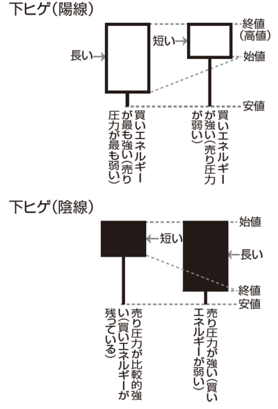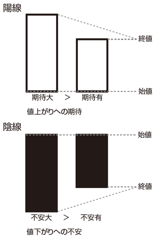 この始値と終値の位置関係が陽線と陰線を決め、強弱を表します。陽線の場合は「強気」としたり、陰線の場合は「弱気」としたりと、投資家心理を表す表現として使われます。