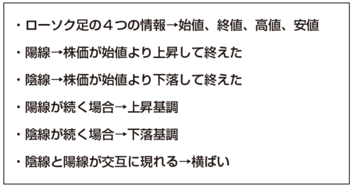そのまま上昇が続く保証はありませんが、陽線が続いているときの方が、取引終了にかけて上昇しているわけですから、取引開始時に株を買って、上昇が続いている間は保有しておくといったことが考えられるわけです。一方、陰線が続いているケースでは、下落基調であると考えられるわけですから、「買うのは下げ止まってから」と判断でき、下落基調のところを買って失敗するケースを減らせます。