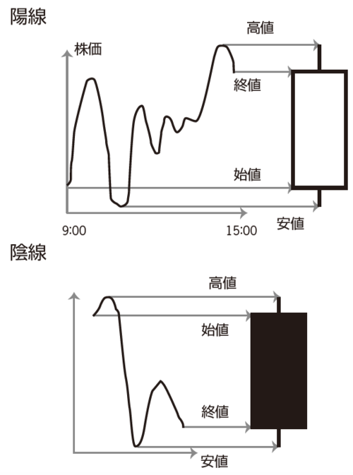 一方、その逆に始値よりも終値が安いケースでは、取引終了にかけて値下がりしたことになり、株価は弱いパターンの「陰線」と呼ばれるローソク足になります。これが基本です。