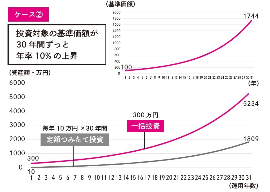 むろん、前にも見たように、投資信託の基準価額が30年間ずっと、年率10%ずつ上昇していった場合、一括投資のほうがはるかに大きく増えます(図表3のケース②)。S&P500や全世界株式に連動するインデックスファンドのようにずっと右肩上がりの上昇が続く金融商品に投資するときは断然、一括投資のほうが有利です。とはいえ、定額つみたて投資でも、かなり大きな利益を上げることができます。