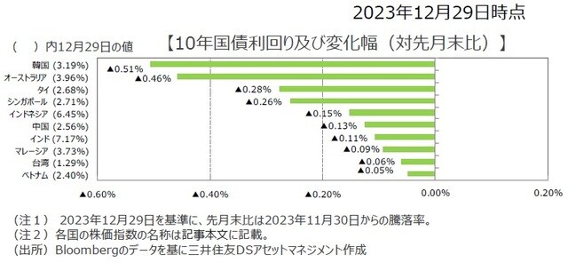 利上げ局面の終了が意識されアジア国債利回りは低下した。特に、成長率見通し引き下げやインフレ率鈍化などをうけ11月末から12月に政策金利維持が発表された韓国、オーストラリア、タイを中心に低下した。また、インドや台湾でも12月に金融政策が維持された。