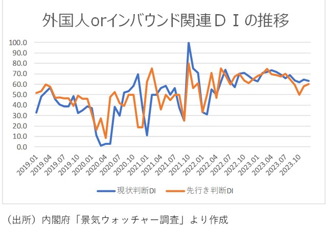 一方、先行き判断で「外国人orインバウンド」関連DIは、49.9と22年4月の46.9以来18ヵ月ぶりの50割れになった10月から、上昇に転じ、11月58.1、12月60.4と改善してきました。