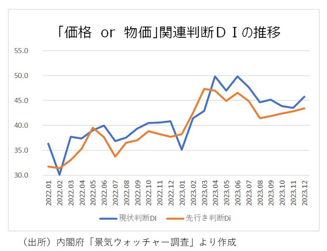 12月の『景気ウォッチャー調査』で、景況感の足を引き続き引っ張った悪材料として目を引くのは11月に続き「価格or物価」関連の判断です。現状判断で172人がコメントしDIを作ると45.8で、213人がコメントし43.5だった11月から41人回答数が減りDIは2.3ポイント上昇しました。景気判断の分岐点50を下回る水準が続いていますが、物価が落ち着いてきたこともあってマイナス寄与度はやや小さくなったように思われます。