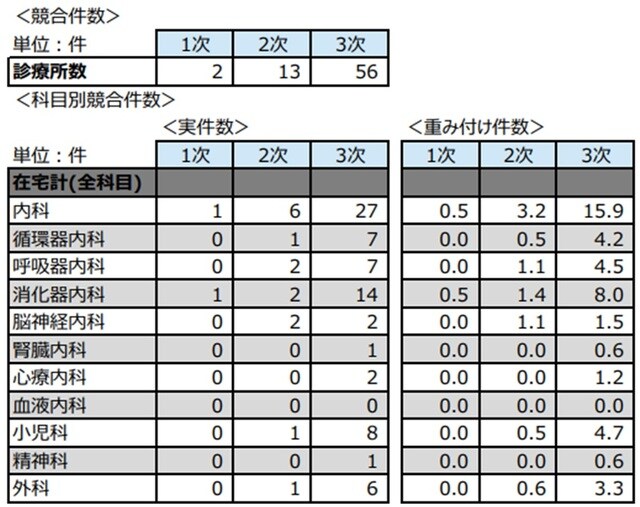 しかし、実際には、看板には複数の診療科を掲げていながら、実態としてはその一部しか診療していない(昔は診療していたが、今はしていないなど)クリニックは、よくあります。そこで、単純に集計された科目別の競合件数(実件数)を、実態にあわせて調整する必要があります。そうして調整された結果が「重み付け件数」です。