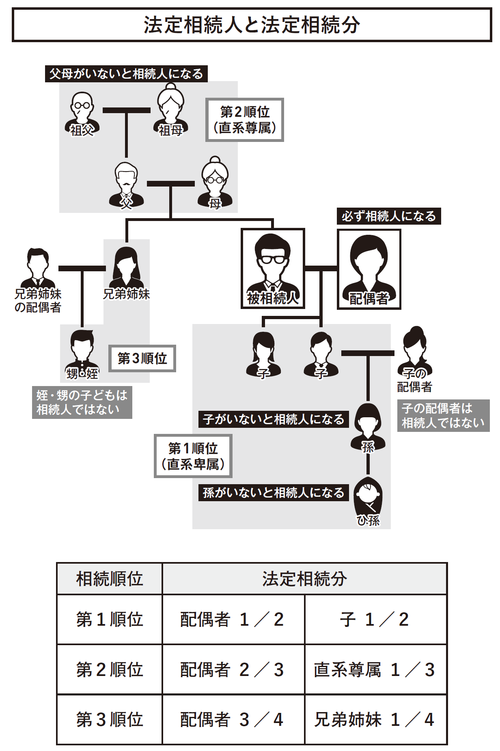 子どもや孫がいなければ、第2順位の直系尊属(親や祖父母)、子どもも孫も、親も祖父母もいない場合は、第3順位の兄弟姉妹が相続人になります(順位と相続分については、下記の図表を参照してください)。