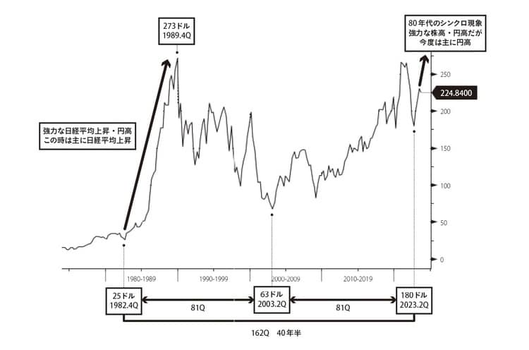 さてその2番目の底2003年4月からさらに20年余(81四半期)のインターバルを置いて2023年5月から相場は急速な上昇に転じ始めた。この日柄は1982年11月のスペクタキュラーな上昇の起点からちょうど40年半(162四半期)、美しい黄金律のタイミングである。