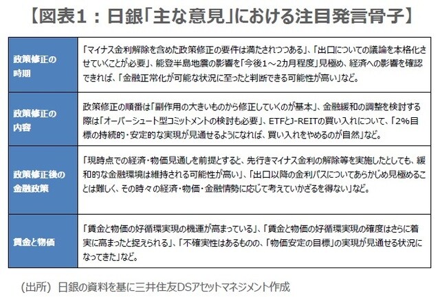 日銀は1月31日、金融政策決定会合(1月22日、23日開催分)の発言内容をまとめた「主な意見」を公表しました。今回は、異次元緩和からの出口を意識したコメントが多くみられ、以下、注目点をまとめていきます。まず、金融政策運営に関する意見では、「マイナス金利解除を含めた政策修正の要件は満たされつつある」、「出口についての議論を本格化させていくことが必要」などの声があがりました(図表1)。