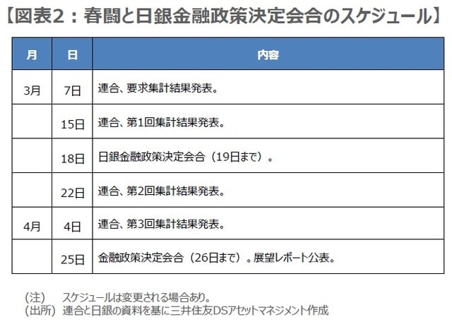 改めて、春季生活闘争(春闘)と日銀金融政策決定会合のスケジュールを確認すると(図表2)、労働団体の「連合」は3月15日に春闘の第1回回答集計の結果を公表し、日銀は3月18日、19日に金融政策決定会合を開催するため、早ければ3月にも政策修正の可能性が考えられます。ただ、4月25日、26日の日銀金融政策決定会合までに、追加で2回の回答集計結果が得られるため、引き続き4月の政策修正を予想しています。