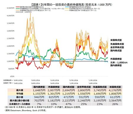 投資期間5年で1,000万円を一括投資する場合、1989年10月末から一括投資を開始するケースから2018年12月末から投資を開始するケースまで、1か月ずつずらした351ケースの最終時価残高の結果を示したものが[図表1]である。